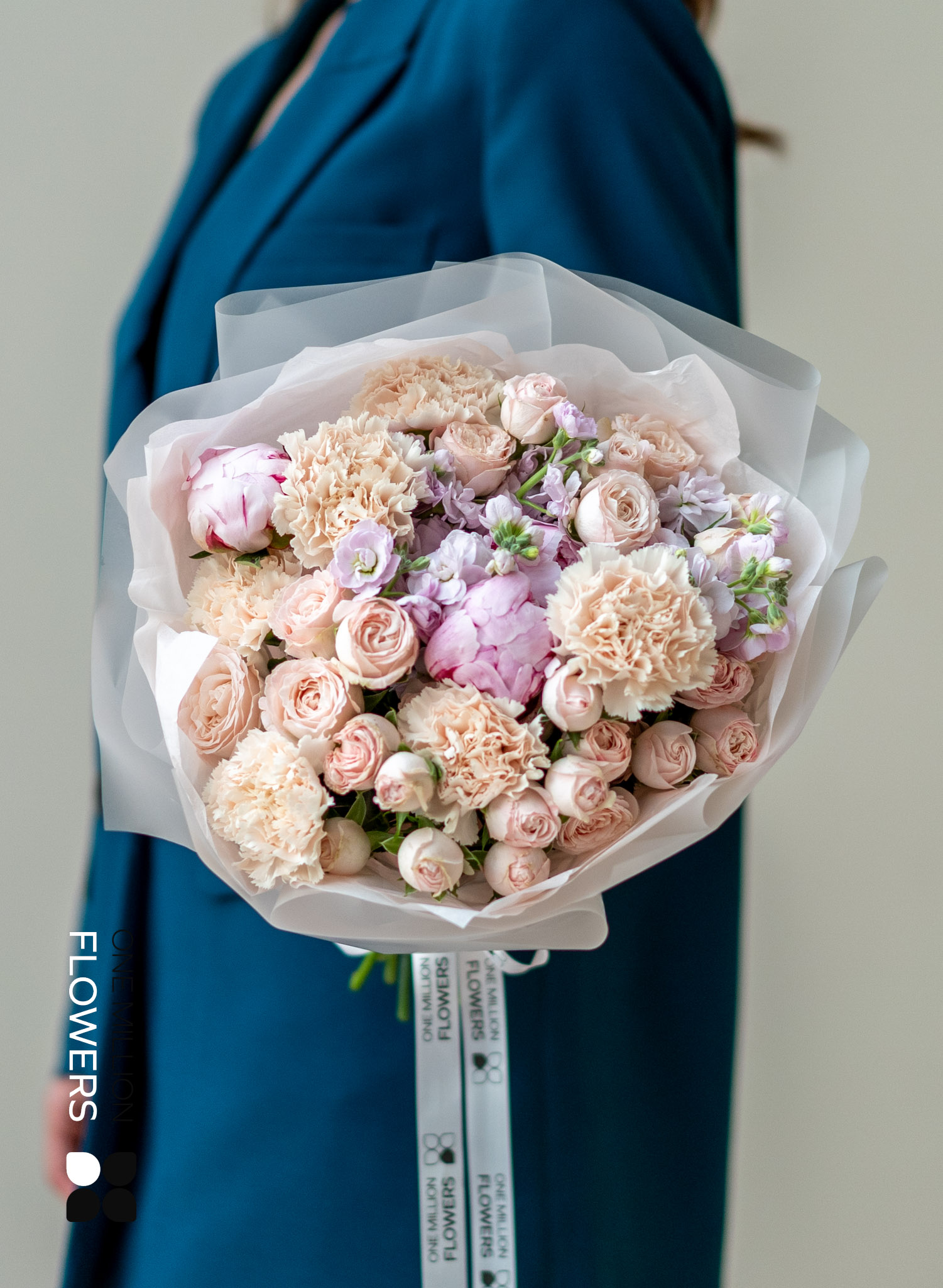 Букет "Свит Арно" White — это восхитительная композиция, созданная для самых требовательных ценителей. Его основа состоит из двух розовых маттиол, символизирующих нежность и романтику. Пять кремовых диантусов добавляют изысканности, а три розовых пиона дарят сладкий, восхитительный аромат, создавая атмосферу уюта и тепла. Завершает этот великолепный ансамбль семь кустовых роз Бомбастик кремового оттенка, которые придают букету особую выразительность и благородство.