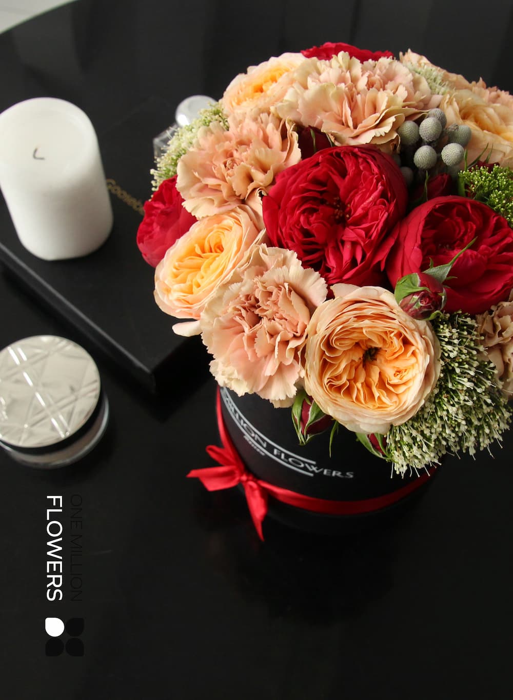 Не забудьте о трогательном дополнении – трахелиум Белый. Эти нежные цветы придают особую воздушность композиции и создают ощущение легкости и свежести. Они прекрасно смотрятся в коробке "Эскада Ред" Black и добавляют букету изысканности и утонченности.
